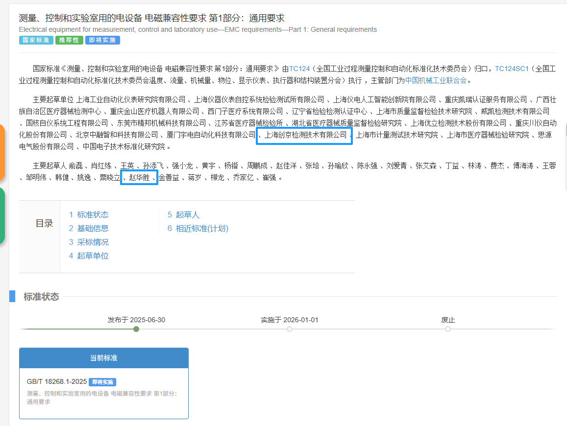 最新消息,2025年06月30日,根據(jù)國(guó)家標(biāo)準(zhǔn)化管理委員會(huì)官網(wǎng)顯示,中國(guó)國(guó)家標(biāo)準(zhǔn)公告,創(chuàng)京檢測(cè)總經(jīng)理趙華勝參與編制的標(biāo)準(zhǔn)GB/T 18268.1—2025《測(cè)量、控制和實(shí)驗(yàn)室用的電設(shè)備 電磁兼容性要求 第1部分:通用要求》推薦性國(guó)家標(biāo)準(zhǔn)批準(zhǔn)發(fā)布,新版標(biāo)準(zhǔn)將于2026年1月1日起正式實(shí)施。